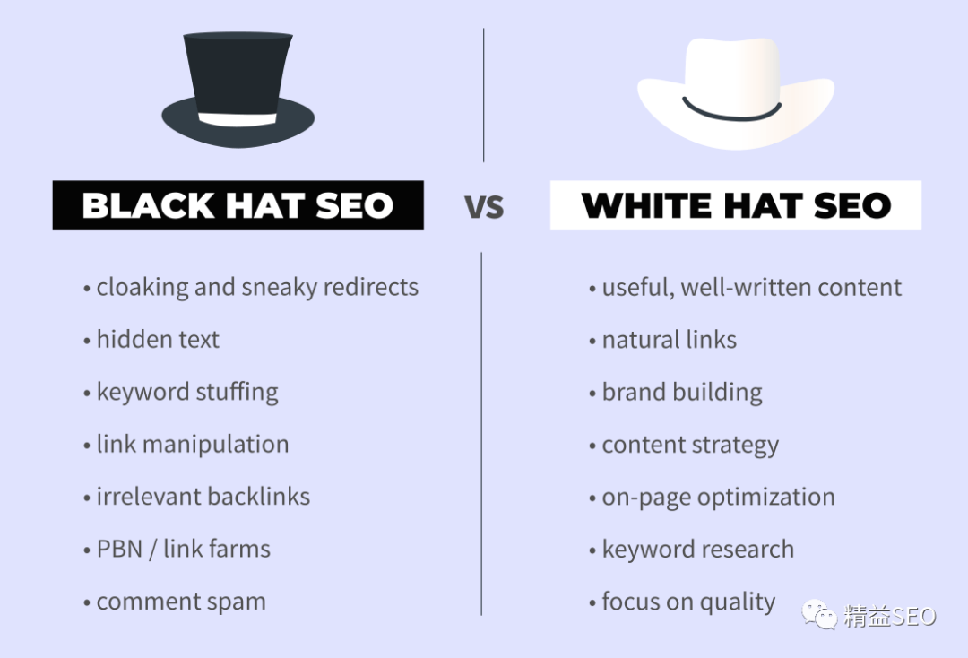 社交媒体网络营销和品牌推广,它们对建立中文网站的信任度和权威性有间接影响请记住,获得成功的 SEO 思路包括页内和页外 SEO 活动05—白帽 SEO 与黑帽 SEO黑帽子和白帽子起源于西方电影他们代表坏人和好人在 SEO 中,这些名词用作描述两组 SEO——遵守 Google 中文网站站长手册规定的规则的人和 不遵守这些规则的人。